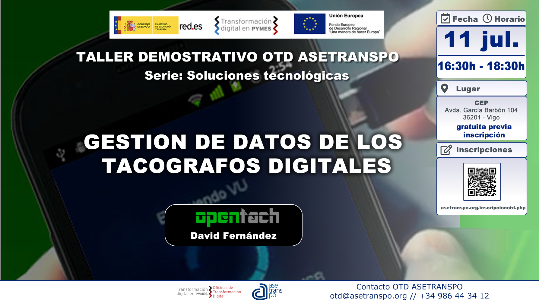 INFORMACION BÁSICA SOBRE PROTECCION DE DATOS: Responsable: ASETRANSPO // Finalidades: Incentivar el uso de las TIC en el sector del transporte y la logística de la región, a través de Acciones y Programas de sensibilización y dinamización a las PYMES y Autónomos en su proceso de transformación digital, mediante la organización de jornadas y/ seminarios, que, serán difundidas a través de la captación de fotografías y/o vídeos mediante su publicación en redes sociales, página web, etc… // Legitimación: Consentimiento del interesado. // Destinarios: Ponentes de las jornadas y/o seminarios. Las Administraciones Públicas competentes, en el marco del Proyecto de OTD. Cualquier otra que resulte de la normativa vigente, así como todas aquellas entidades con las que sea necesaria la comunicación, con la finalidad de cumplir con las finalidades anteriormente mencionadas. // Derechos: acceso, rectificación, oposición, supresión, portabilidad, limitación del tratamiento y a no ser objeto de decisiones individuales automatizadas. // Información adicional: Disponible la información adicional y detallada en www.asetranspo.org