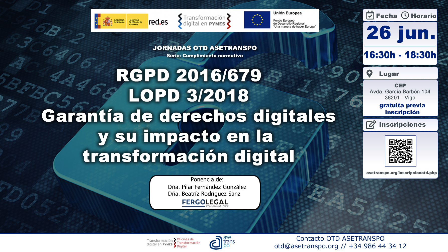 INFORMACION BÁSICA SOBRE PROTECCION DE DATOS: Responsable: ASETRANSPO // Finalidades: Incentivar el uso de las TIC en el sector del transporte y la logística de la región, a través de Acciones y Programas de sensibilización y dinamización a las PYMES y Autónomos en su proceso de transformación digital, mediante la organización de jornadas y/ seminarios, que, serán difundidas a través de la captación de fotografías y/o vídeos mediante su publicación en redes sociales, página web, etc… // Legitimación: Consentimiento del interesado. // Destinarios: Ponentes de las jornadas y/o seminarios. Las Administraciones Públicas competentes, en el marco del Proyecto de OTD. Cualquier otra que resulte de la normativa vigente, así como todas aquellas entidades con las que sea necesaria la comunicación, con la finalidad de cumplir con las finalidades anteriormente mencionadas. // Derechos: acceso, rectificación, oposición, supresión, portabilidad, limitación del tratamiento y a no ser objeto de decisiones individuales automatizadas. // Información adicional: Disponible la información adicional y detallada en www.asetranspo.org