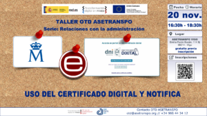 Programa: ¿Qué es un certificado digital? Importar/Exportar un certificado digital Renovación certificado digital ¿Cómo y para que se puede usar el certificado digital? ¿Qué es NOTIFICA? Como darse de alta en el sistema de notificaciones Consulta de notificaciones Ponente: Isabel Alonso. Responsable Dpto. Tramites ASETRANSPO Las Oficinas de Transformación Digital puestas en marcha en toda España por el Ministerio de Economía y Empresa, a través de la entidad pública Red.es, cuentan con un presupuesto global de cinco millones de euros.…
