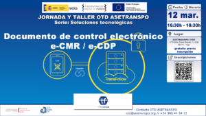 APLAZADO POR ESTADO DE ALARMA "CORONAVIRUS" Programa: JORNADA OTD ASETRANSPO: DOCUMENTO DE CONTROL ELECTRÓNICO (e-CMR, e-CDP) En qué punto se encuentra en España y Europa el despliegue. Ventajas de una gestión digital de Cartas de porte y CMRs. Cómo es y funciona la plataforma TransFollow (cómo se expide, se firma, se comparte) Qué pueden hacer los chóferes en el proceso. Funcionalidades adicionales (localización, gestión de temperatura, sello de mercancía, contenedores, delegación de funciones, transportistas sucesivos, materiales peligrosos, balance de pallets,…